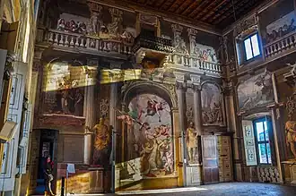 The most important room in the palazzo is the Salone d'Onore, also known as Salone of the Fasti Romani. Its frescos consist of two bands: the inferior band depicts the history of Rome, and the superior band displays dames and signori, musicians, servants, and mendicants peering over a balustrade.[6]