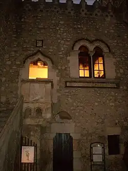 On four main floors and constructed around a courtyard, the Catalan Gothic palazzo is crenellated. The principal floor has fenestration of pairs of lancet windows divided by columns. The courtyard walls are decorated by reliefs illustrating The Creation.