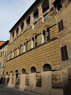 The palace, has six ground floor arches made from rusticated stone, now mostly walled. The second floor retains the mullioned windows.[3] 43°19′00″N 11°20′19″E / 43.316695°N 11.338571°E