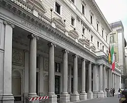 On a site occupied in antiquity by the Temple of Marcus Aurelius, the medieval buildings on the site were cleared for a structure erected by the Ludovisi (1659) that became the offices of the vicegerente of the vicariate of Rome. To house the general director of the postal service for the Papal States, who moved here in 1814, the palazzo was completely rebuilt by Pope Gregory XVI to designs by Giuseppe Valadier carried out by Pietro Camporese the Younger.[2] At Valadier's urging, Camporese added a portico built with twelve elegant Roman columns brought from the ruins of Veii, supplemented with two pairs of columns flanking the main doorway, retrieved from the basilica of San Paolo fuori le Mura, which burned in 1823.[3]