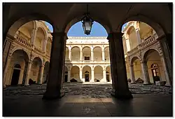 The piazza in front, once called piazza della fiera del lunedì, ultimately acquired its present name of piazza dell’Università.[2] Behind the prominently arcaded facade, in the piano nobile, is a large hall (aula magna) frescoed by Giovanni Battista Piparo. The center of the palace has a large courtyard,[3] decorated with an elaborate pavement design using black and white stone. The architect Vaccarini had used similar projects in the Collegio, now Convitto Cutelli, and the Collegio dei Gesuiti (adjacent to St Francis Borgia church).[4]