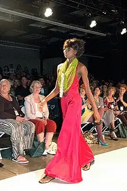 Palazzo pants for women first became a popular trend in the late 1960s and early 1970s.[1] The style was reminiscent of the wide-legged cuffed pants worn by some women fond of avant-garde fashions in the 1930s and 1940s, particularly actresses such as Katharine Hepburn, Greta Garbo and Marlene Dietrich.[2] During the 1960s, some upscale restaurants resisted modern fashion trends by refusing to admit women wearing pants, which were considered inappropriate by some proprietors.[3] This posed a problem for women who did not want to wear the skirt styles that were then in fashion. Some women opted to circumvent restaurant bans on women in pants by wearing palazzo pants or culottes as evening wear.[4]
