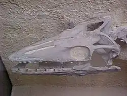 Mosasaurs are the most common marine reptiles in the Niobrara Chalk and the most successful ones in the sea at the time. Several different genera representing the four different subfamilies of Mosasauridae: the Tylosaurinae, Plioplatecarpinae, Mosasaurinae, and Halisaurinae, were present in Niobrara. They were the dominant carnivorous marine reptiles and ate cephalopods, fish, turtles, pterosaurs, birds, and even plesiosaurs.[26] There is evidence of them consuming other smaller mosasaurs. Despite this, mosasaurs often fell prey to some of the large sharks at the time, such as Cretoxyrhina.[27]
