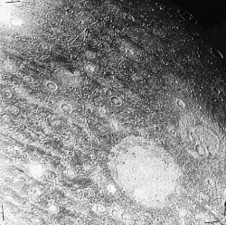 On an icy moon of the outer Solar System, a palimpsest is a crater whose relief has disappeared due to creep of the icy surface ("viscous relaxation") or subsequent cryovolcanic outpourings, leaving a circular albedo feature, perhaps with a "ghost" of a rim. Icy surfaces of natural satellites like Callisto and Ganymede preserve hints of their history in these rings. A typical example is Memphis Facula on Ganymede, a 340 km wide palimpsest.[2]
