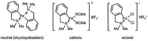 The palladacycles can be neutral, cationic, or anionic. Depending on the nature of the coordinating ligands, the neutral palladacycles can be monomers, dimers, or bis-cyclopalladated.