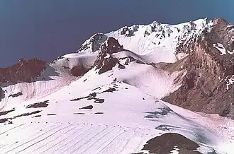 Palmer Glacier is an extinct glacier on the south slopes of Mount Hood in the U.S. state of Oregon. With glacial ice movement having stopped in the mid-1980s, it is now considered a snowfield rather than an active glacier.[2] The former glacier, now snowfield, is situated at an elevation range of 9,300 to 6,200 feet (2,800 to 1,900 m), and was named for Joel Palmer, an Oregon pioneer. Palmer Glacier is the most well-known of the twelve glaciers on the mountain, despite no longer technically qualifying as a glacier, and is a popular destination for snowsports enthusiasts as it is the only US resort that consistently runs its chairlifts from winter through summer.