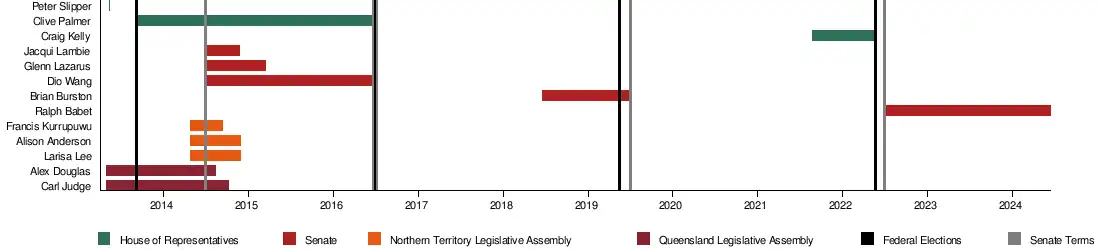 At state and territory level, the party has been represented in the Parliaments of Queensland and the Northern Territory. Two members of the Queensland Legislative Assembly joined in April 2013, while three members of the Northern Territory Legislative Assembly, joined the party in April 2014. Both the Queensland members and the NT members left the party later in 2014.[15][16] The party unsuccessfully contested the South Australian, Tasmanian, and Victorian state elections in 2014. Since the COVID-19 pandemic in Australia, the party has supported anti-lockdown politics.