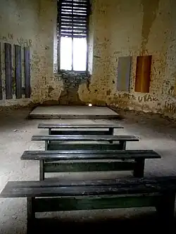 There was no pastorate at Paluküla Church, it had 100 seats. The church was built in 1820 for the family of Baron Ungern-Sternberg as a cemetery church, however, due to the high groundwater level, it was not possible to build a burial crypts below ground level, so there is no graveyard near the church. In 1939, after the annexation of Hiiumaa island by the Soviet Union and its transformation into a military zone, the church was used as a warehouse for military equipment. The church tower was used as a lookout position. After the Second World War, the building again served as a warehouse and the tower as an observation post. Over time it was gradually abandoned until, in 1989, the tower was ruined by a fire.[2] The tower was repaired in 1994 and a roof was built in 1996.