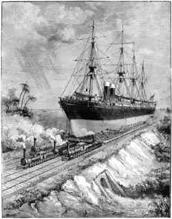 The French diplomat and entrepreneur Ferdinand de Lesseps was the driving force behind French attempts to construct the Panama canal (1881–1889). De Lesseps had made his reputation by successfully constructing the Suez Canal (1859–1869), a route which had soon proved its value in international commerce.[19] After this success, he actively sought new projects. In 1875, de Lesseps was approached by the Societe Civile Internationale du Canal Interoceanique de Darien (also known as the "Türr Syndicate"), a syndicate formed to promote the building of an interoceanic canal across Panama. Its directors were Hungarian freedom fighter István Türr, financier Jacques de Reinach and Türr's brother-in-law Lt Lucien Bonaparte-Wyse.[20][21] Between 1876 and 1878, Bonaparte-Wyse and Armand Reclus investigated several potential routes across the Isthmus of Panama. Bonaparte-Wyse rode by horseback to Bogotá, where he obtained a concession from the Colombian government to build a canal across Panama (20 March 1878). The agreement, known as the "Wyse Concession" was valid 99 years and allowed the company to dig a canal and exploit it.[22]