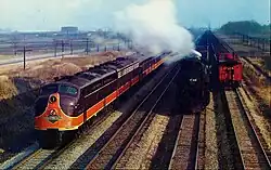The Panama Limited was dieselized and streamlined in 1942, during World War II. The Illinois Central had ordered two lightweight sets of equipment before the attack on Pearl Harbor; after an appeal, the War Production Board allowed their delivery. The first diesel/electric-powered streamlined run of the Panama Limited was on May 3, 1942, on an 18-hour schedule.[5][6] On hand for the first run was Janie Jones, the widow of famed engineer Casey Jones.[7] The Panama Limited carried a new orange-and-brown paint scheme that later became standard on Illinois Central passenger trains.[8] Today, Metra, Chicago's commuter rail system, honors this scheme by identifying the Metra Electric District, the Illinois Central's former commuter service to the southern suburbs, as "Panama Orange" on system maps and timetables.