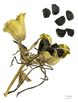 The flowers are large, white and fragrant. The perianth tube and the corona are present. It differs from the similar Hymenocallis in its numerous seeds with a thin black skin.[8] The loculicidal capsule fruit[7] bears black, glossy seeds.[9]
