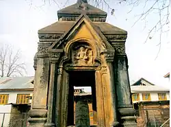 The temple is made of ashlar stone masonry, and stands atop a high platform in the middle of a tank. The temple is tri-ratha on the outside, and square on the inside. The top consists of a two-storeyed pyramidal roof.[22] The roof of the temple is unique in being one of the few of such temples to majorly survive, providing an idea of what the now-demolished roofs of Hindu temples at Martand, Awantipora and elsewhere in Kashmir may have looked like.[16] The pyramidal summit at the top has been lost, and the roof is now topped with a modern dome and three-orbed finial.[23] There are four doors in four directions, with lintels supporting triangular pediments containing trefoil arches. The front facing trefoil arch contains a relief of Shiva in his Lakulisha form, while the remaining three are empty but may have had similar reliefs.[24]