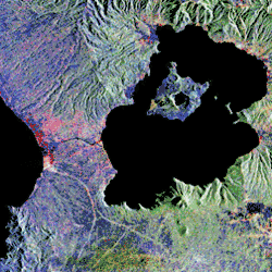 Satellite image of Taal Lake (right) and Balayan Bay (left) with the Pansipit River linking the two bodies of water