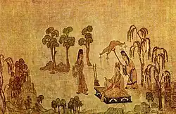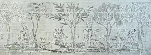The baoyi bodai was a type of loose paofu with long ribbons for men.[4]: 14 The baoyi bodai gave its wearer a casual and simple appearance.[4]: 14 Loose type of clothing was often worn during leisure times as found in the depictions of the Seven Sages of the Bamboo Grove where men had their upper clothing open, allowed their inner garment to be exposed, a knotted belt or sash which would tied to the upper garment at the chest level, and their skirts and lower garment would be held by a belt made of clothing which would be knotted at the front of the lower garment.[18]: 315