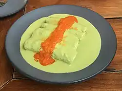 Papadzules (Spanish pronunciation: [papaˈtsules]; Mexican Spanish, from Mayan [papatsʼuːles]) is a traditional dish from the Yucatán Peninsula resembling enchiladas. In its simplest form it consists of corn tortillas dipped in a sauce of pepita (pumpkin seeds) filled with hard-boiled eggs, and garnished with a cooked tomato-pepper sauce.