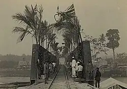 A first bridge for crossing the river was built in 1901 under the administration of the British together with other iron bridges in Kimanis and Membakut.[8] However, it was swept by strong floods into the river where it was replaced with a new iron bridge but also damaged by another floods in 1903.[9] A ferry service was temporarily made while the bridge undergoing repair. In 1904, another strong floods damaging the currently repaired bridge with most of its structure been swept away. A temporary bridge constructed in November 1908 also being swept away by floods.[10] Finally in December 1908, a new bridge was constructed but again damaged by floods in 1913.[11] In 1915, the railway service finally make its way to the Papar town with the opening of a railway bridge.