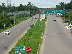 The municipality has 129.6 km of major roadway, most of which are state highway. There are eighteen vehicular bridges. The main highways include Federal highway 180, the Villahermosa-Comalcalco-Paraíso state highway and the Villahermosa-Jalpa de Méndez-Paraíso state highway. Seat transportation is mostly concentrated at the Dos Bocas port.[3] There is a mall highway that links the town of Paraíso with the port of Dos Bocas. There used to be a road connection between Paraíso and the port of Sánchez Magallanes, but this road has been washed out in places. A rail line between the Dos Bocas port and Villa Chontalpa is under construction.[14] There is an intercity bus terminal and local public transport consisting of vans, small buses and taxis.[3]