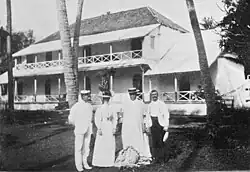 We walked through the blazing hot sun of the tropic afternoon, down the palm-shaded main street of Avarua town, to the great grassy enclosure that surrounds the palace of the queen. One enters through a neat white gate; inside are one or two small houses, a number of palms and flowering bushes, and at the far end, a stately two-storeyed building constructed of whitewashed concrete, with big railed-in verandahs, and handsome arched windows. This is Makea's palace, but her visitors do not go there to look for her. In true South Sea Islander fashion, she keeps a house for show and one for use.[4]