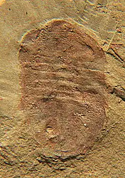 | A hymenocarine with no known head fossils. The material known show that the carapace had a pronounced pair of notches at its front, as well as a posterior notch at its rear. The body had at least 13 tergite-pleurite rings, which terminate in a pair of rounded caudal rami, which are fringed with setae. | ![]() |