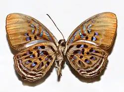 Paralaxita telesia has a wingspan of about 35–45 millimetres (1.4–1.8 in). In males both wings are mainly dark brown, with a crimson apex and a whitish large spot on the forewings. Underside is carmine with bands and spots of blue and black. The apex of the forewings is rufous. Hindwings are crossed near the outer margin by a band of light blue and a band of light yellow, each bordered with black.[2]