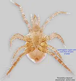 Adult and deutonymph: In both adults and deutonymphs, opisthogastric region has more than 40 pairs of setae (see figure). In all other species of Parasitidae, opisthogastric region has fewer than 30 pairs of setae.[8]