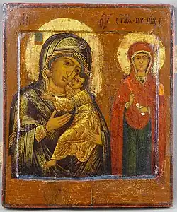 The most common idol was the sculpture of Paraskeva Pyatnitsa – not only for Russians, but also for neighbouring peoples.[4] The folklorist A. F. Mozharovsky writing in 1903,[a] noted that in the chapels "in foreign areas" there were "roughly carved wooden images of Saints Paraskeva and Nicholas ... All carved images of Saints Paraskeva and Nicholas have the common name of Pyatnits ['Friday']".[5] Sculptures were widespread among the Russians. According to a 1908 historical sketch of Sevsk, Dmitrovsk and Komaritskaya volost by Svyatsky, commonly, Paraskeva were:[6]: 22  "a painted wooden statue of Pyatnitsa, sometimes in the form of a woman in oriental attire, and sometimes in the form of a simple woman in poneva [traditional skirt] and lapti [bast shoes] ... placed in churches in special cabinets and people prayed before this image".