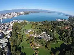 The city park is located south of Lake Geneva at the Quai Gustave-Ador in Geneva. It has a surface of 200,000 m2 and hosts very old and tall trees, Geneva's biggest rose garden, orangeries, an alpine garden and an 18th-century villa. Also two theaters, a playground as well as a paddling pool for the children are found there.