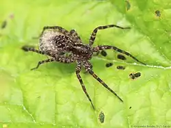 The spider does not weave a web, but is a quick and agile hunter and chases and leaps on any prey that comes into sight, piercing it with its fangs. Their diet consists largely of flies and other small insects. They are often active very early in the spring and between the months March to July. They can often be seen in full daylight, taking advantage of its vision and scurrying around in the open or on low vegetation, hunting for prey and warming themselves in the sunshine on patches of bare soil.[3] During mating, the male stops a few centimetres away from the female and raises itself high on its hind legs and stretches its palps out and waves them to attract the female, moving gradually closer to her. If the female rejects his advances she will lunge forward and the smaller male will retreat and return a few seconds later to start his display again. After hatching from the eggs, the baby spiderlings stay on their mother and are carried by the female on her back until their second moult at which point they are large enough to fend for themselves.[2]