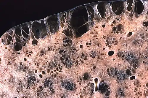 Lung parenchyma is the substance of the lung that is involved with gas exchange and includes the pulmonary alveoli.[10]