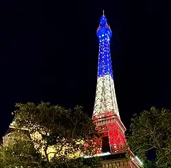 A free five-minute light show debuted in 2019, illuminating the Eiffel Tower in red, white, and blue. The show, which cost $1.7 million to create, recurs throughout each night.[62][130]