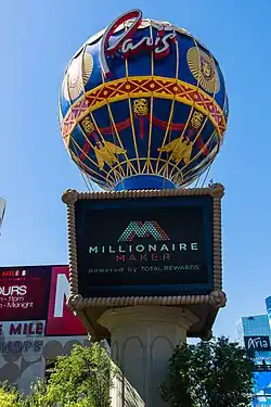 The resort's main sign along the Strip depicts a Montgolfier hot-air balloon, with a diameter of 75 feet (23 m).[50][51] The $6 million sign, rising 150 feet (46 m), was designed by Bergman and built by Las Vegas-based Federal Signs.[52]