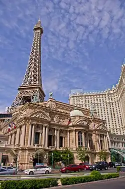 Paris Las Vegas was designed by architect Joel Bergman.[41] The Paris-themed facade along the Strip was created by Keenan Hopkins Suder & Stowell Contractors Inc. According to Dave Suder, "Paris Las Vegas was not intended to be a true, historical recreation of the real buildings in Paris, France. Everything was stylized, sized and proportioned to fit the project. But, the actual detail that went into the work is very detailed. The sculpted elements were carefully executed."[42] The facade includes replicas of the Arc de Triomphe (two-thirds scale), the Louvre, the Paris Opera House,[43][44][19] and the Musée d'Orsay.[42] The designers traveled to France to study these landmarks.[19][45]