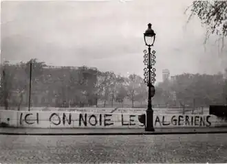 Graffiti on the Pont Saint-Michel in 1961: "Ici on noie les Algériens" ("Here we drown Algerians").[1][2] Dozens of bodies were later pulled from the river Seine.