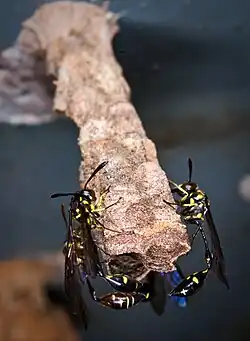 Parischnogaster alternata, the black hover wasp, is a eusocial wasp in the genus Parischnogaster. It is native to South-East Asia, and builds its nests in cavities located in dark and damp locations.[1][2] The nests of black hover wasps are often found in clusters, which serves as a passive defense mechanism against predators.[3] The annual colony cycle begins with nest initiation by a single foundress though colonies typically consist of 2-3 associative females and helpers that aid in brood development, nest construction, and colony defense.[4][5] Indicative of the name, female P. alternata are known to strategically hover near nests when visiting other colonies before landing. These intrusions produce responses ranging from aerial fighting to cooperative food sharing.[6]