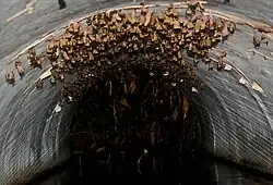 Parischnogaster alternata builds dense clusters of nests in dark, damp cavities including caves and man-made structures such as vaults under bridges, water pipes, and the ceilings of grottoes.[3] The nests of P. alternata typically appear brown with grey and pale bands due to the use of mud and vegetables. The composite materials of the nests include a mixture of mud, sand, and plant hairs. The nests are cylindrical in shape with a size ranging from 1.5 cm in diameter and 6.5 cm in length. Similar to other species in the Stenogastrinae subfamily, the nests contain a low number of cells with a maximum of 35 total.[3] There are two known types of nests based on location. The most common type is built on flat surfaces and the other type hangs from thread-like suspensions from ceilings.[11]