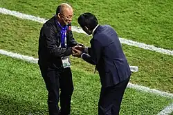 In the 2019 AFC Asian Cup, Vietnam reached the quarter-finals but lost to eventual runner-up Japan, 1–0.[29] Vietnam also became the runner-up in the 2019 King's Cup as they lost 5–4 in a penalty shootout following a 1–1 draw in the final against Curaçao.[30] Park won the gold medal at the 2019 Southeast Asian Games, thus winning the first football title for Vietnam as a united country at the games.[31] He was awarded the second-class Labor Order by the Vietnamese government the next year.[32] In the very next Southeast Asian games in 2022, he led Vietnam to the second straight title, before he resigned from the under-23 team.[33]
