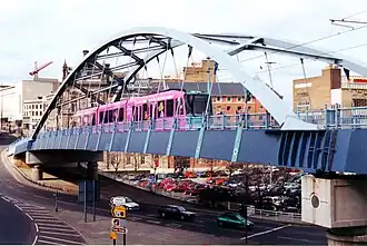 Park Square Bridge,[1] also known as the Supertram Bridge, is a prominent bridge in the city of Sheffield, England. It was constructed in 1993 using a bowstring, or tied arch design. The bridge carries the Sheffield Supertram system from Commercial Street onto the Park Square roundabout.