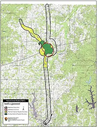 About 368 acres of the battlefield have been saved thus far, all by the American Battlefield Trust in consort with its partners, including a local group, the Parker's Crossroads Battlefield Association.[2] In 2011, the trust inaugurated a campaign to preserve what is called the "keystone tract", the final unpreserved piece of land from the old battlefield. Most of the Confederate artillery was located on this 52-acre parcel. Many preservationists believe that if this land falls into the hands of commercial developers, the ability to interpret the battlefield in a meaningful way will be lost.[3] It has been an affiliated area of the Shiloh National Military Park since 2019.[4]