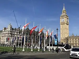Parliament Square features all of the British flags, the flags of the United Kingdom, its four countries,[1] the county flags[1] and the three flags of the Crown Dependencies and the sixteen heraldic shields of the British Overseas Territories.[2] Alongside all of the British flags, Parliament Square also has all of the 56 flags of the Commonwealth of Nations.