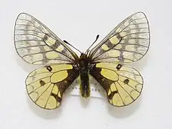 Note: The wing pattern in Parnassius species is inconsistent and the very many subspecies and forms make identification problematic and uncertain. Structural characters derived from the genitalia, wing venation, sphragis and foretibial epiphysis are more, but not entirely reliable. The description given here is a guide only. For an identification key see Ackery P.R. (1975).[1]