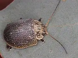 Paropsis is a genus of Chrysomelidae, commonly referred to as tortoise beetles, which includes over 70 described species.[3] Their small size, bright colours and patterns, and roughly hemispherical shape cause them to be mistaken for beetles in the family Coccinellidae (ladybirds).[4] They are distributed across Australia, New Zealand and Papua New Guinea.[5] Some species, Paropsis atomaria in particular, have been introduced to the United States in California with first official documented sightings in 2022.[6] They primarily feed on Eucalyptus but there are a few that feed on Baeckea, Kunzea and Leptospermum. Species within this genus are noted as pests. For example, Paropsis charybdis is a pest of Eucalyptus in New Zealand.[7]