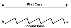 Consider an example in which there are two points A and B having the same altitude, as shown in Figure 1. In the first case, we have a flat profile connecting them. Here, if we leave some round marbles in the middle that move back and forth in a random fashion, they will roll around randomly but towards both ends with an equal probability. Now consider the second case where we have a saw-tooth-like profile between the two points. Here also, the marbles will roll towards either end depending on the local slope. Now if we tilt the whole profile towards the right, as shown in Figure 2, it is quite clear that both these cases will become biased towards B.