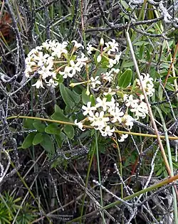 Parsonsia praeruptis is a non-twining, non-climbing Parsonsia,[1] endemic to New Zealand and is a member of the dogbane family Apocynaceae.[2][3] It is found only in the shrubland of the Surville Cliffs, North Cape Peninsula, where it scrambles through "openly branched, prostrate windswept shrub(s)".[1]