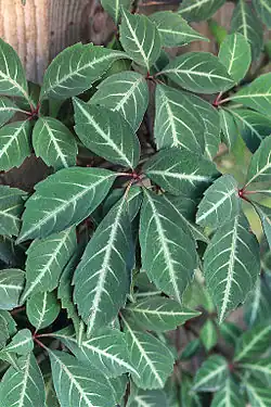 It is a vigorous, deciduous tendril climber growing to 10 m (33 ft). It has a more restrained growth than the other Virginia creepers.[2] The large palmate leaves consist of five to nine oval leaflets, each up to 12 cm (5 in) long, with strong white veining. The leaves colour to a brilliant red in autumn before falling. Clusters of inconspicuous flowers in summer may be followed by black fruits.[3][4]