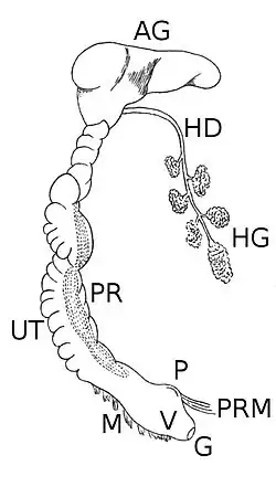 The penis opens into the posterior portion of the papillar structure in the form of a small tube; it proceeds through the thick vaginal wall in an oblique anterior direction, and becomes slightly enlarged or bulbous towards its termination. The vas deferens, as previously stated, is free to a very limited extent and is imbedded in the vaginal wall. Its posterior prostatic course through the prominent folds or plications of the oviduct is tubular, thence open, but for a short distance enfolded on all sides by the above-mentioned plications. From this point to the albumen gland, it is a well-marked area of a rusty brownish tint and somewhat separated from the uteral portion by the longitudinal folds. The uterus is thrown into numerous sacculations, and its interior walls are richly convolutely plicated. There is no indication of a receptaculum seminis. The albumen gland is very large, a usual feature in this group of animals; in outline, it is roughly boot-shaped. The hermaphrodite duct enters near the base of the albumen gland; it is a simple straight tube, with several short lesser tubes branching from it and uniting with the several masses which form the hermaphrodite gland. The latter are closely convoluted structures and imbedded in the liver.[7]