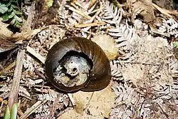 These large snails live in litter, among plants on the ground and under logs in kauri forests and in shrubland.[4] In some areas they have been reported to at times frequent underground habitats including burrowing deep into soft soil.[9] They are also found in shrublands with non-native species like Hedychium and in forests with non-native plants including plantations of Pinus radiata.[4]