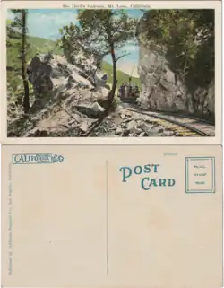 The Mountain Division, originally built as a 3 ft 6 in (1,067 mm) narrow-gauge[5] line, began with a trolley that ascended Lake Avenue to a turnoff near Las Flores Street, along a private right-of-way through the Poppyfields district, and proceeded into Rubio Canyon to the foot of Echo Mountain. Since this part of the line ran through the upper end of the residential community, it had station stops at Newkirk (Las Flores), Poppyfields, Hygeia (recovery hospital), and Roca before entering the Rubio Canyon. A transition bridge was installed to cross the Rubio Wash named Las Flores Bridge.[6] At Rubio there was a large platform that spanned the canyon with an integrated 12-room hotel, the Rubio Pavilion. Other features at the pavilion were a series of stairways and bridges that ascended the canyon for viewing some eleven waterfalls, all of which were named.[7] The Mountain Division's tracks were converted to 1,435 mm (4 ft 8+1⁄2 in) in 1903.[8]