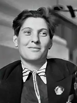 Praskovya "Pasha" Nikitichna Angelina (Russian: Праско́вья Ники́тична Анге́лина; December 30 [O.S. January 12] 1912 – 21 January 1959) was a Deputy of the Supreme Soviet of the Soviet Union, udarnik and Stakhanovite at the time of the first Five-Year-Plans. She was recognized as one of the first female tractor-operators in the USSR and became a celebrity as a symbol of the technically educated female Soviet worker.[1][2]