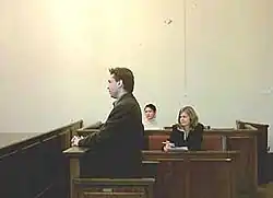No preventive measure was applied to Nieznalska.[12] The first hearing took place on 16 September 2002.[9] Wojciech Cieślak served as Nieznalska's defense attorney throughout the entire process.[46][b] Witnesses who claimed their religious feelings had been offended were questioned. They admitted, however, that they had not personally seen the exhibition but were familiar with it only from an article in Gazeta Wyborcza and a television report by TVN.[12] The installation, as evidence in the case, was secured by the prosecutor's office. Tomasz Pączek, a private individual, acted as an auxiliary prosecutor.[47] Nieznalska did not admit to committing the alleged acts[12] and consistently maintained throughout the entire process that she did not intend to offend religious feelings.[48]