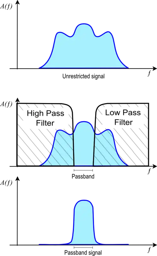 A bandpass-filtered signal (that is, a signal with energy only in a passband), is known as a bandpass signal, in contrast to a baseband signal.[1] The bandpass filter usually has two band-stop filters.